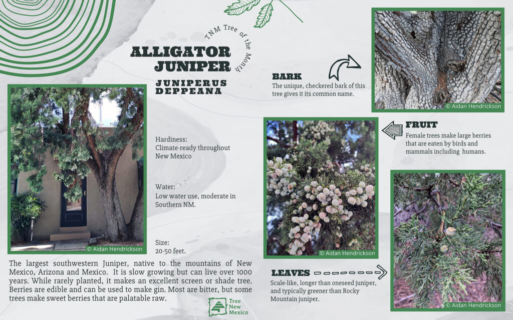 Description: Alligator juniper is a medium to large evergreen tree native to northern Mexico and the southwestern United States (Arizona, New Mexico, and western Texas. The bark is very distinctive, forming hard, dark gray-brown, cracked square plates resembling alligator skin. It is sometimes multi-stemmed and grows quickly. It is highly adaptable to dry, sunny, and hot locations.