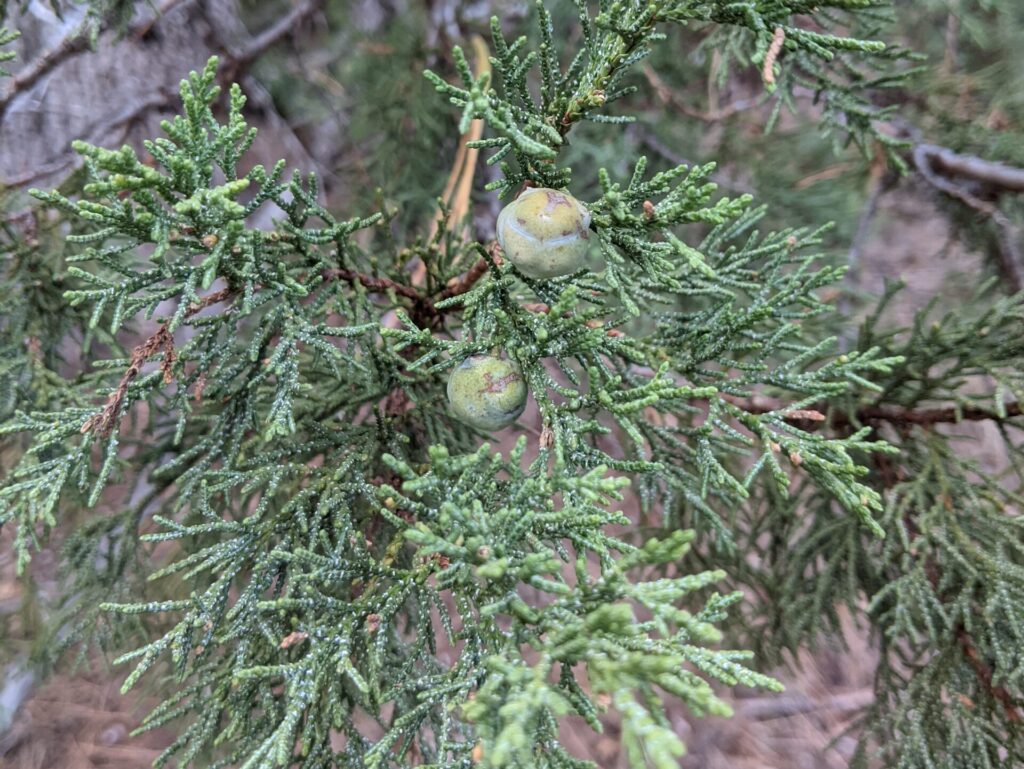 Fruit: Berrylike cones (technically not a fruit but referred to as berries) are green when young and mature to an orange-brown with a whitish waxy bloom.