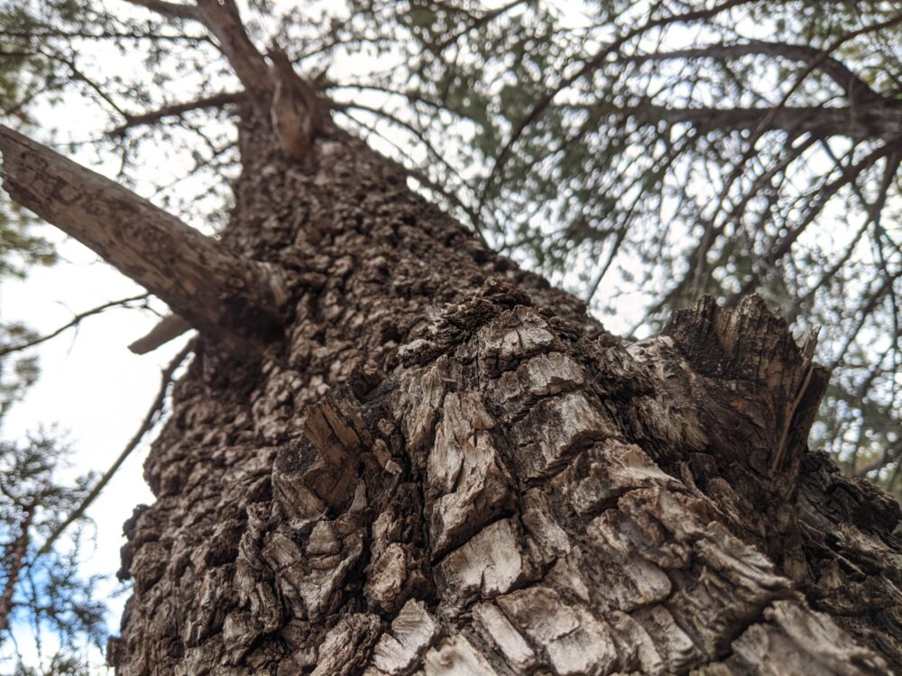 Bark: Forms hard, dark gray-brown, cracked square plates resembling alligator skin.