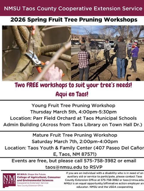 March 5, 4-5:30 pm in Taos: Young Fruit Tree Pruning Workshop with Taos County Extension Agent Will Jaremko-Wright, SEE FLYER BELOW
