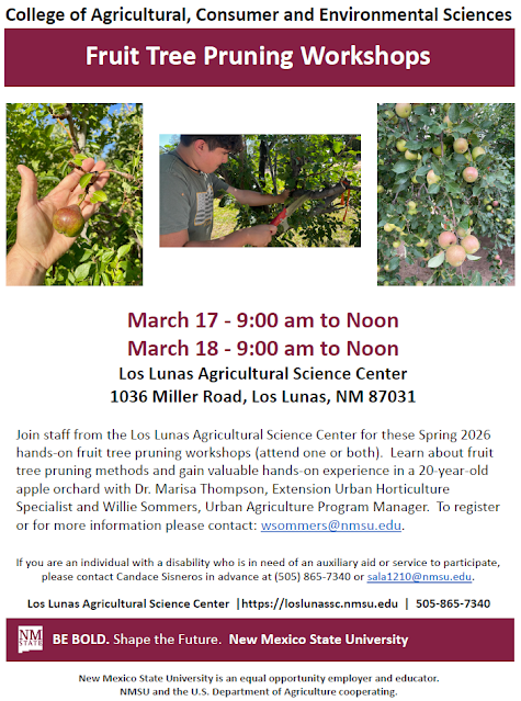 - March 6, 9 am – 3:30 pm at Los Luceros in Alcalde: Annual Fruit Growers Workshop. $20 per person. For pre-registration, please email Elena at eare@nmsu.edu or call her at 505-852-4241. See detailed FLYER below.