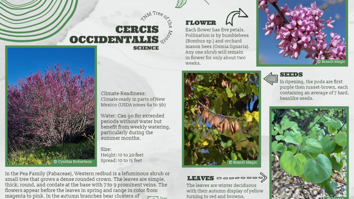 Description: Cercis occidentalis, Western redbud, is a small tree or shrub in the legume family, Fabaceae. It grows at elevations of 4,000 ft. or less in canyons and other steep slopes with rocky soil along streams. This is a drought-tolerant, sun-loving tree, growing mostly as a single tree but sometimes in shrubby clumps. It is native to California, Arizona, Nevada, and southern Utah, with small populations in northern Mexico. It thrives in the diverse habitats of New Mexico.