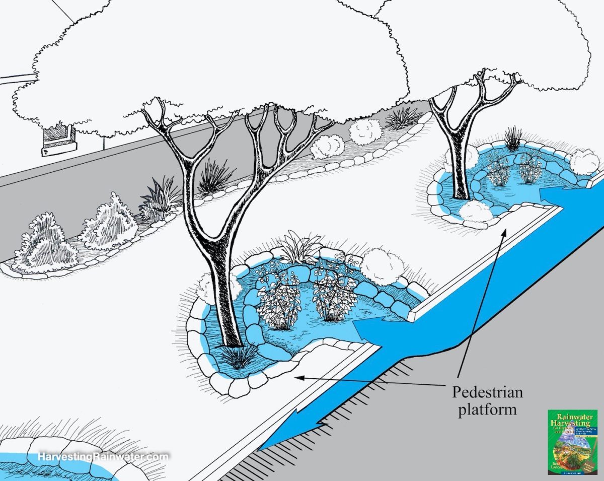 These eddy basins collect water from the street to irrigate native trees and other plants. Credit with: Reproduced with permission from Rainwater Harvesting for Drylands and Beyond, by Brad Lancaster, www.HarvestingRainwater.com.”
