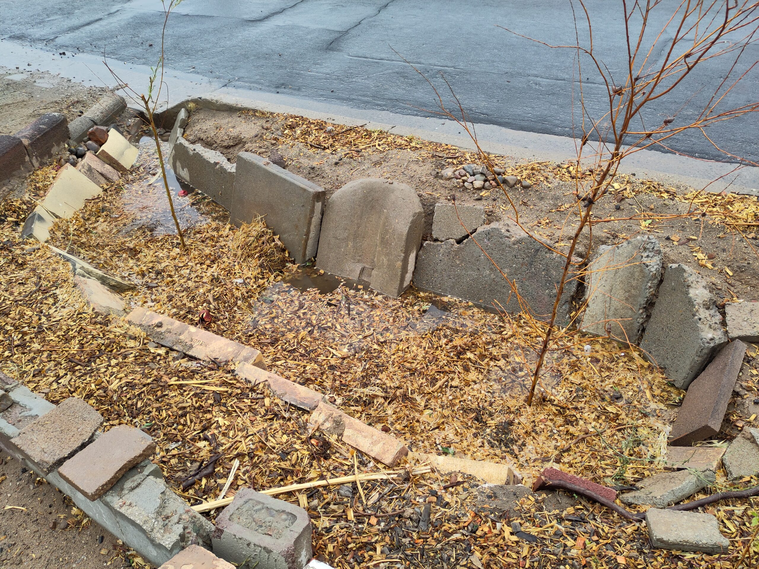 A basin stabilized with salvaged concrete "urbanite." The trees planted are experimental coyote willows, which may not survive drought. Photo from Cool it Burque, www.coolitburque.org